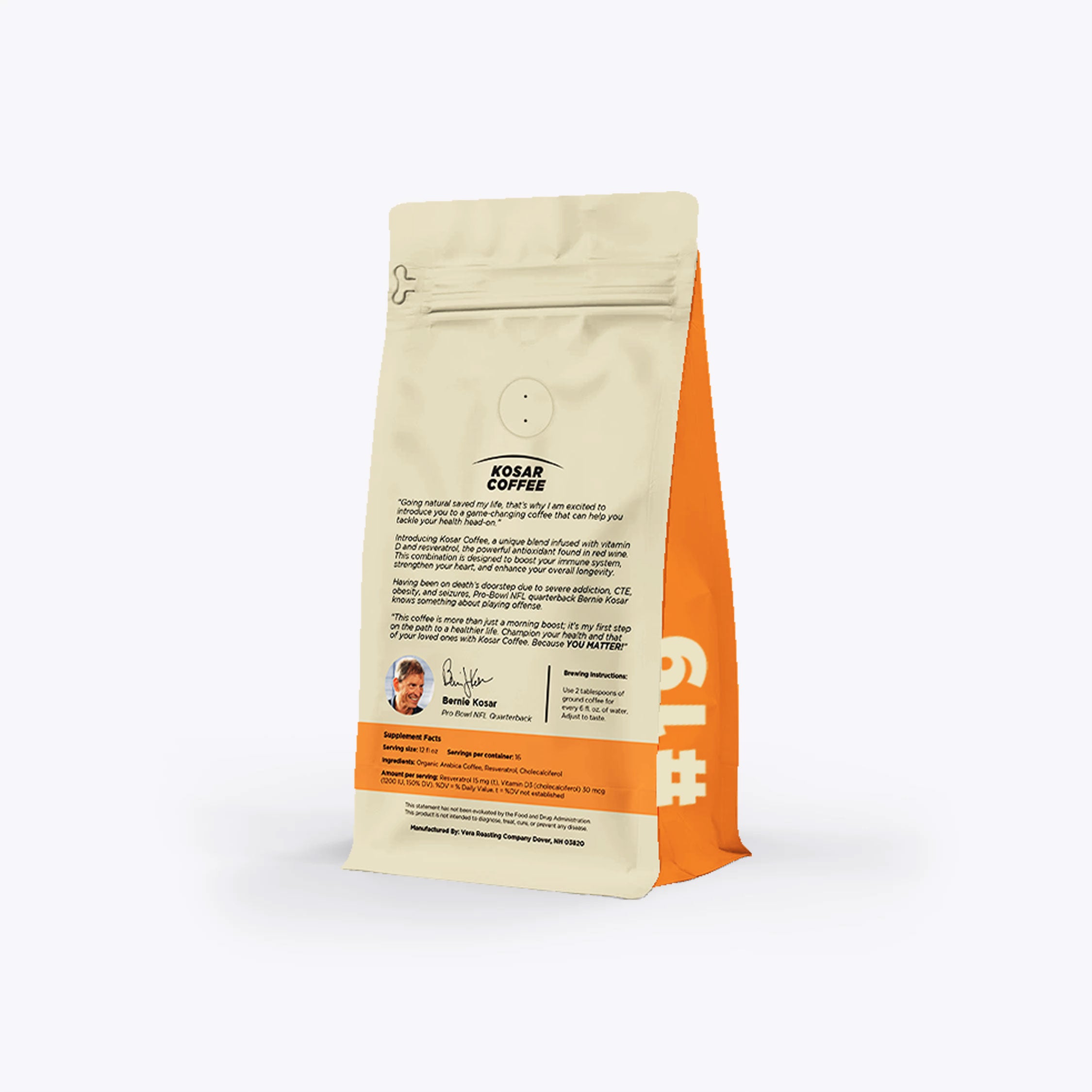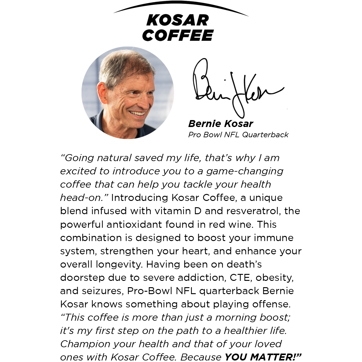 Kosar Coffee Original Blend is the perfect pick-me-up for those looking for more than just a caffeine boost. Our deliciously smooth blend is infused with one of nature’s most beneficial antioxidants, resveratrol, and Vitamin D3 for an added health boost. With every sip, you'll get the benefits of resveratrol, warm rays of sunshine, and an undefeated coffee flavor.